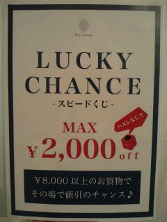 ブージュルードでは、4/4(金)〜4/15(火)の期間中、¥8,000以上のお買い物でその場で値引のチャンス!その名も、LUCKY CHANCE −スピードくじ−を行います!!