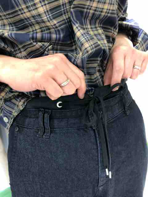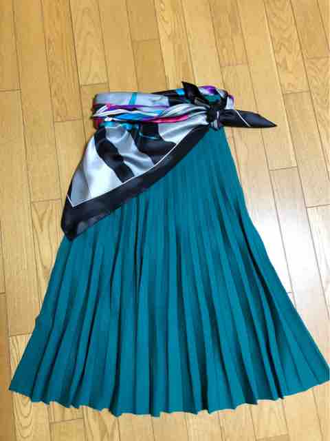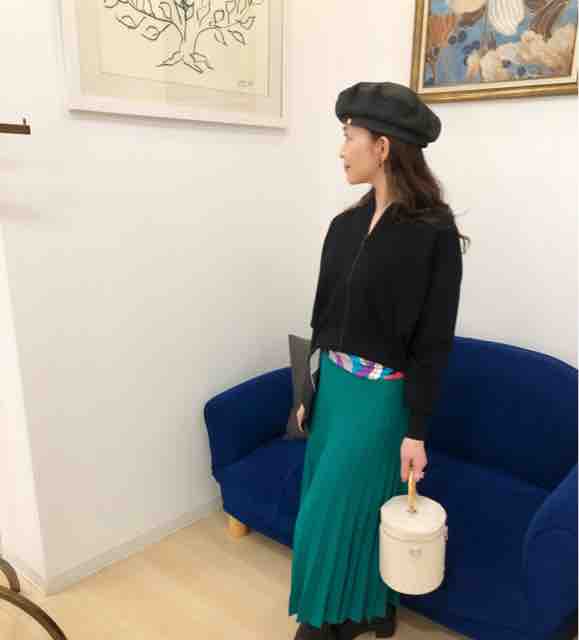 ヴィンテージスカーフをウエストに巻いてアクセントに。