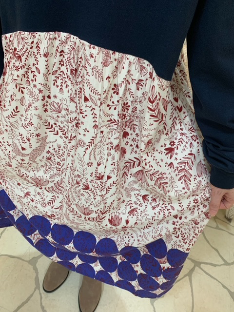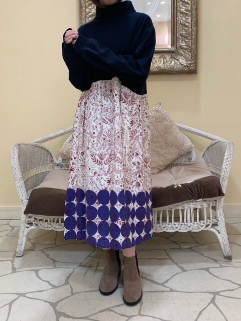 ハイネックのスウェットトップスに、ヴィンテージのようなスカートを組み合わせたデザインが個性的!