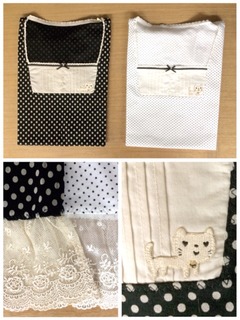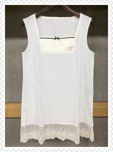 ドット地に裾レースやネコのワッペン、タック入りのヨーク、小さなリボン等が配された凝ったデザインです。