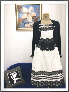 ワンピースは、はりのある素材でレース使いが上品な一枚