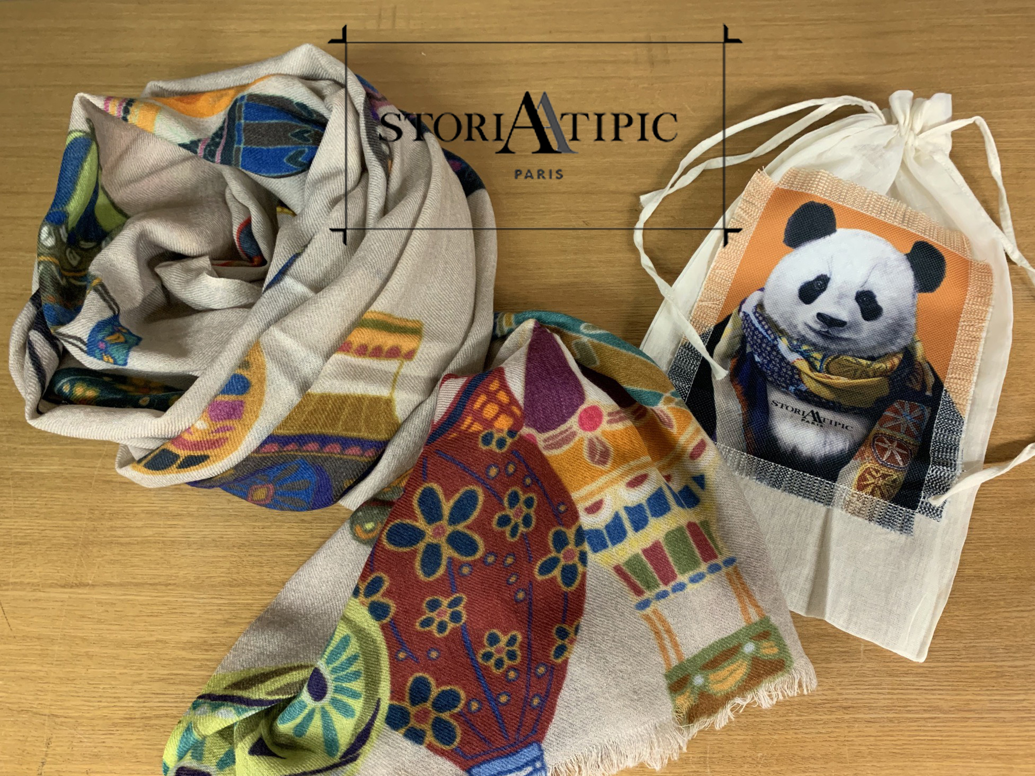 今回は全てのストールに、ブランドアイコンのオシャレパンダちゃんがアップリケされたオリジナルバッグがペアになっています^^