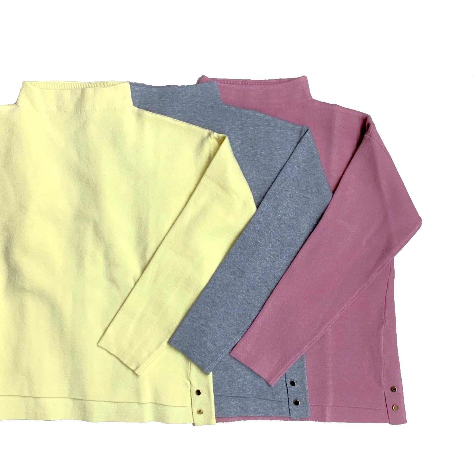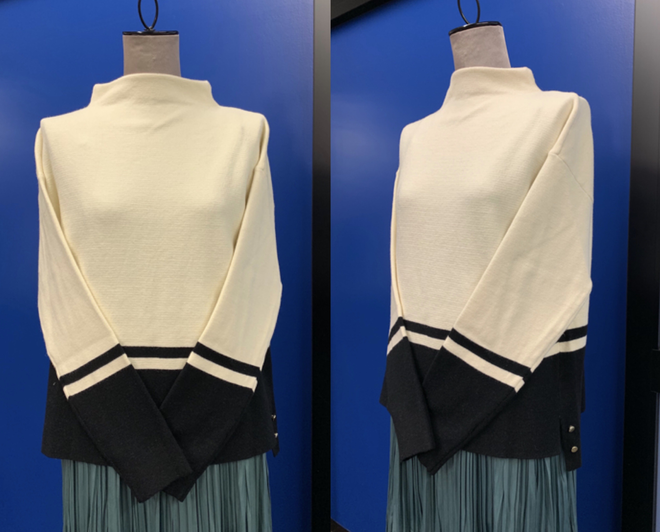 そしてこちらは、裾サイドの金ボタンがポイントになったボトルネックニット。