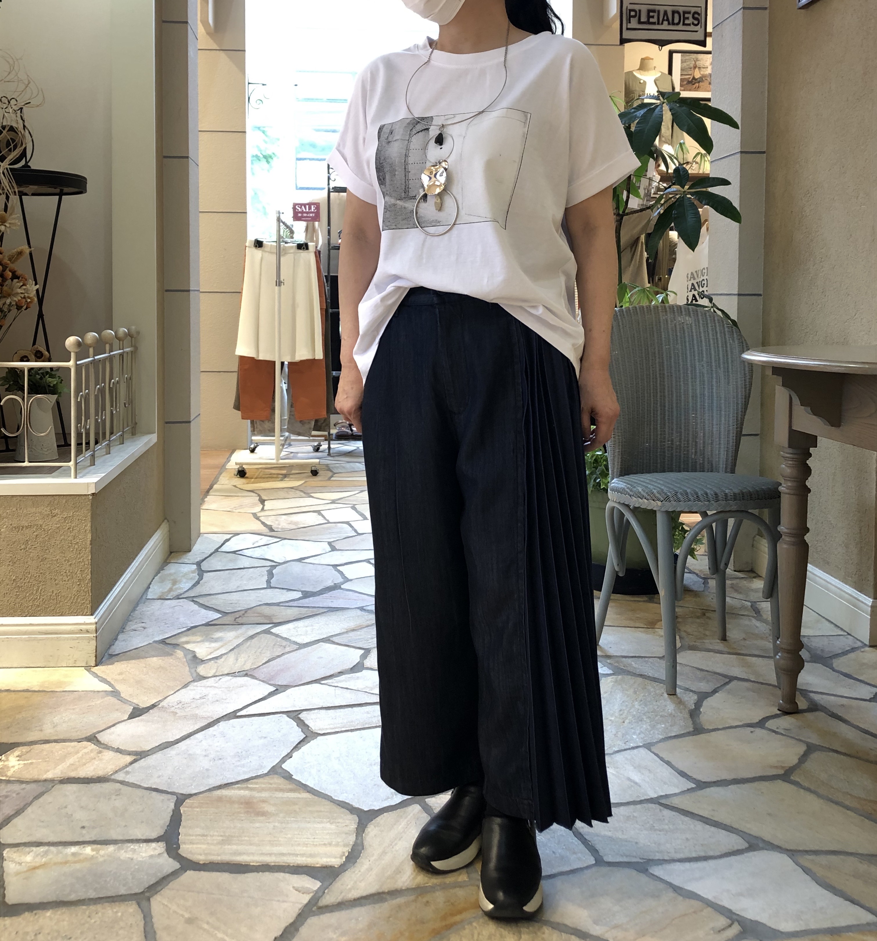 白の転写プリントのTシャツが爽やか^ ^