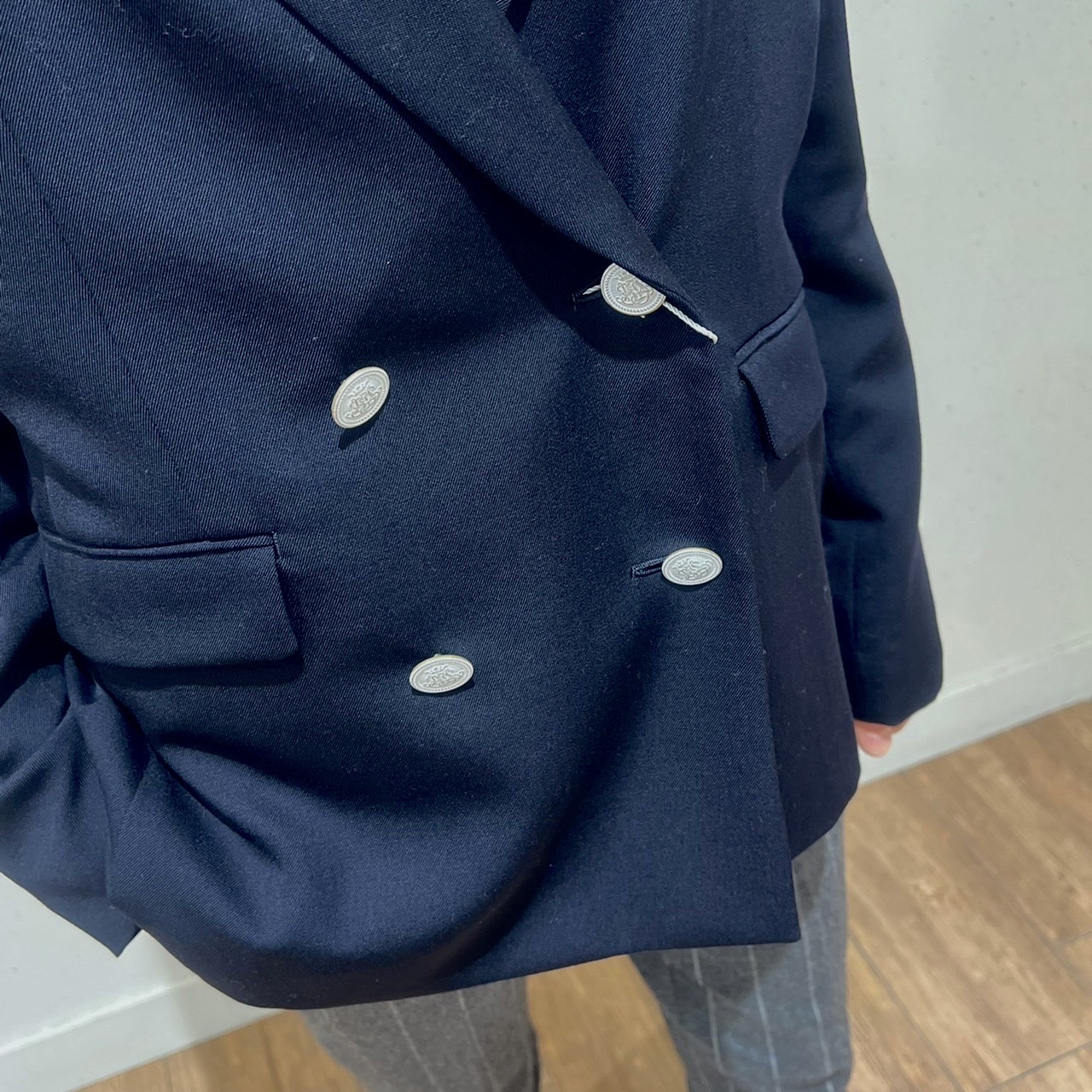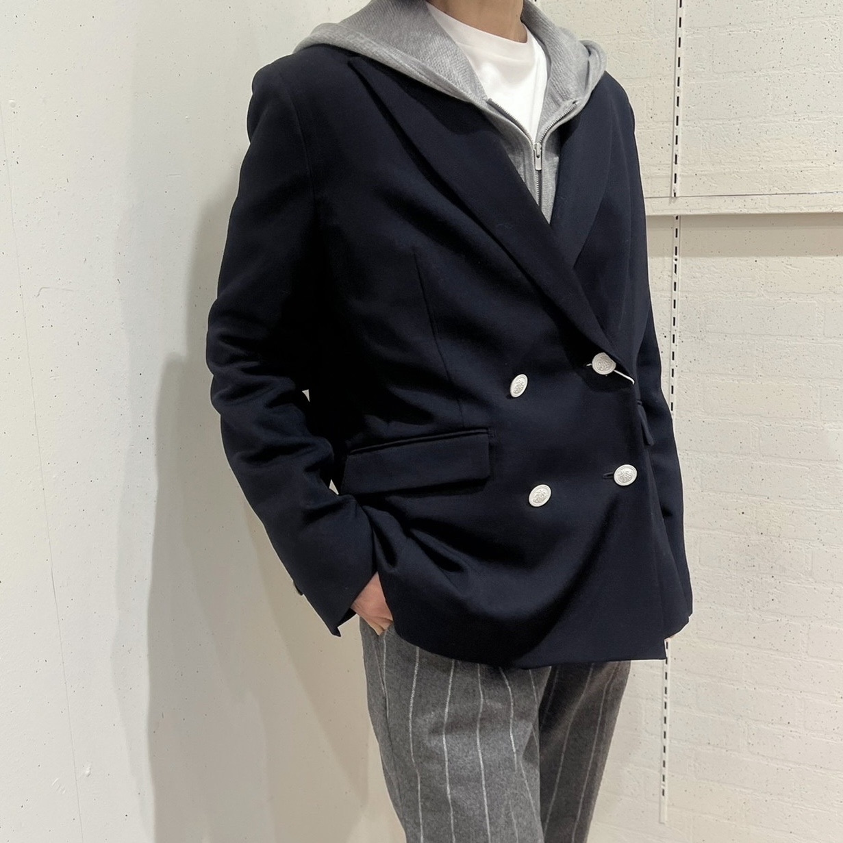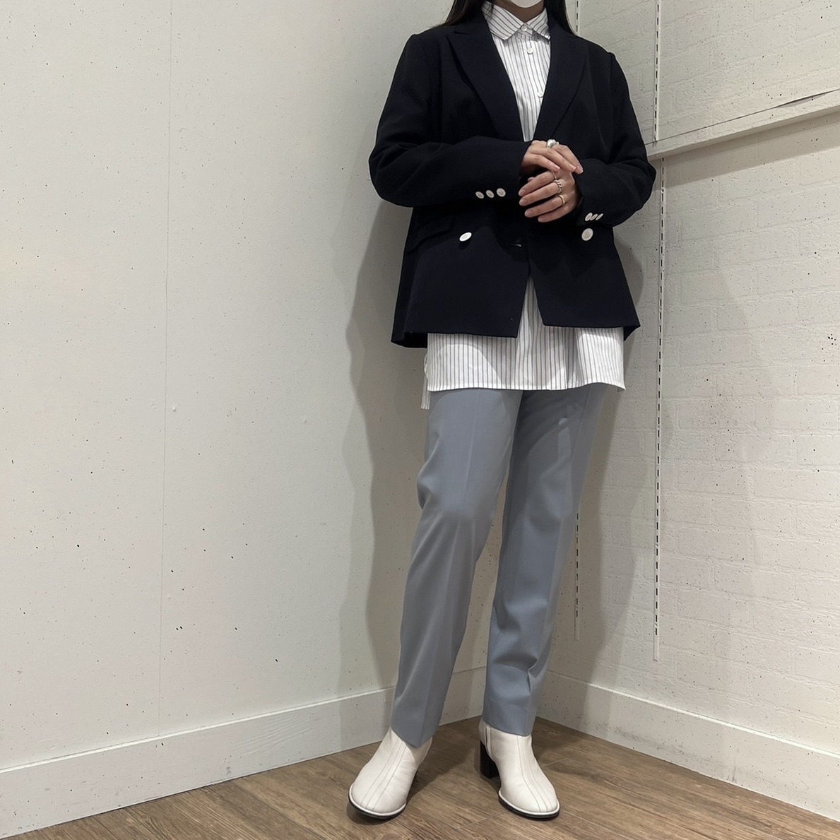 カラーリングの得意なスタッフは、ネイビー→ブルー→スカイブルー→ホワイトという流れが気持ちの良いジャケットコーデ。